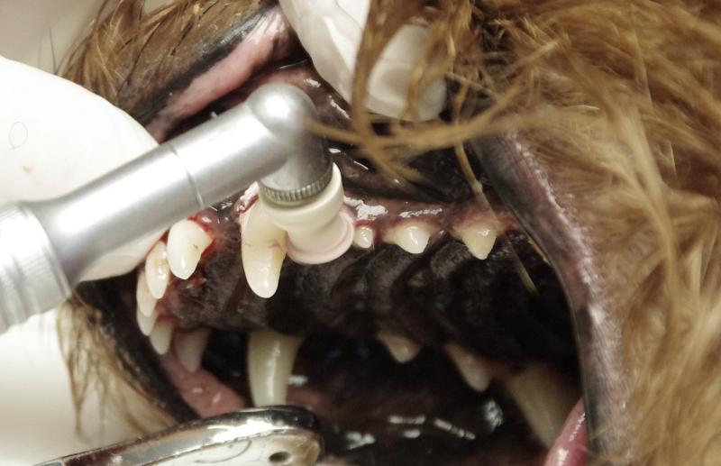 Mikromotor s nástavcem pro lestění zubů. Leštění výřazně zpomaluje ukládání zubního kamene a tím se prodlužuje interval pro odstraňování zubního kamene